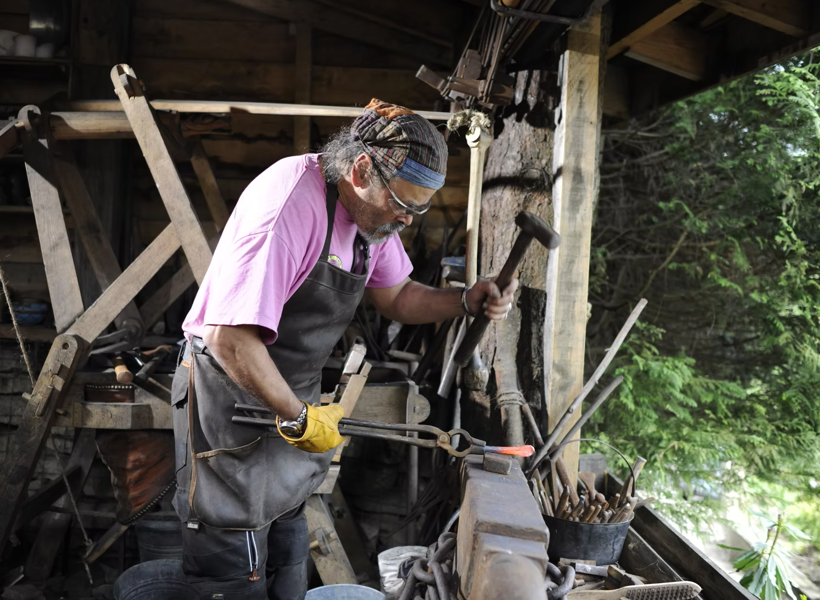 Hughes works from his forge in Surrey, unusual in that it is a Viking forge which he constructed from local timber. Here Hughes uses charcoal and hand power to create his blades.